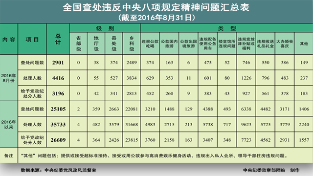 为掌握全国贯彻落实中央八项规定精神情况,中央纪委在31个省区市和新疆生产建设兵团、139个中央和国家机关、106个中央企业、15个中央金融企业建立了落实中央八项规定精神情况月报制度。2016年以来,截至8月31日,全国查处违反中央八项规定精神问题情况如下: