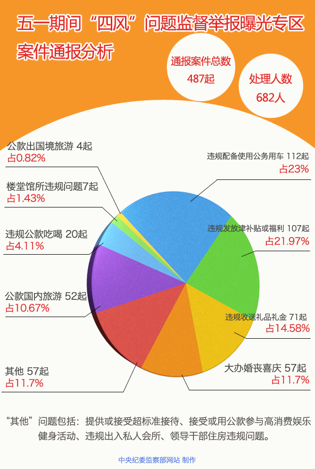 从通报数据来看,违规配备和使用公车高居第一位,共112起,占处理总数的23%;违规发放津补贴或福利共107起,占处理总数的21.97%,列第二位;违规收送礼金礼品71起,占处理总数的14.58%,列第三位;大办婚丧喜庆57起,占处理总数的11.70%,列第四位。这四项总共有347起,超过处理总数的70%。